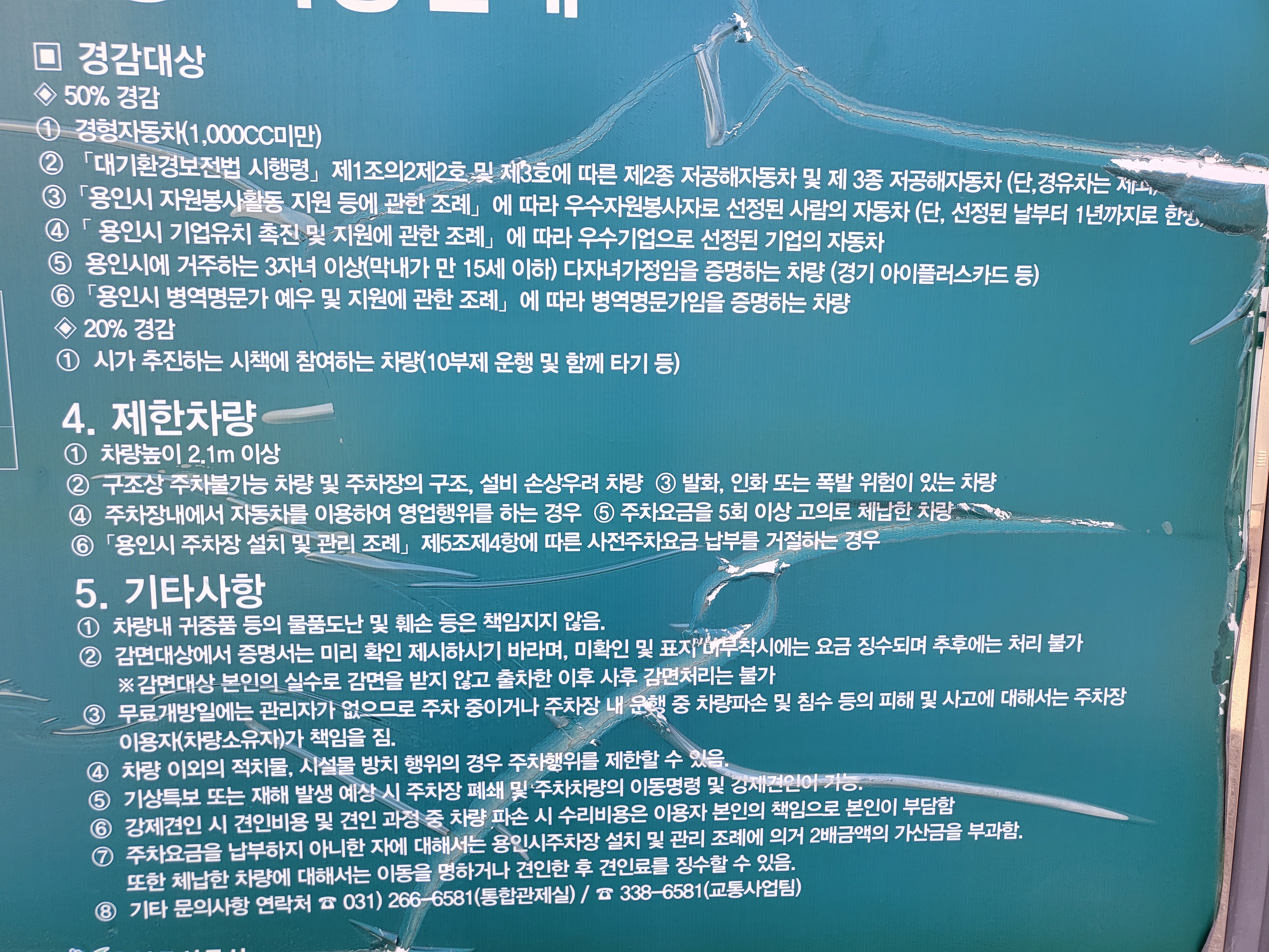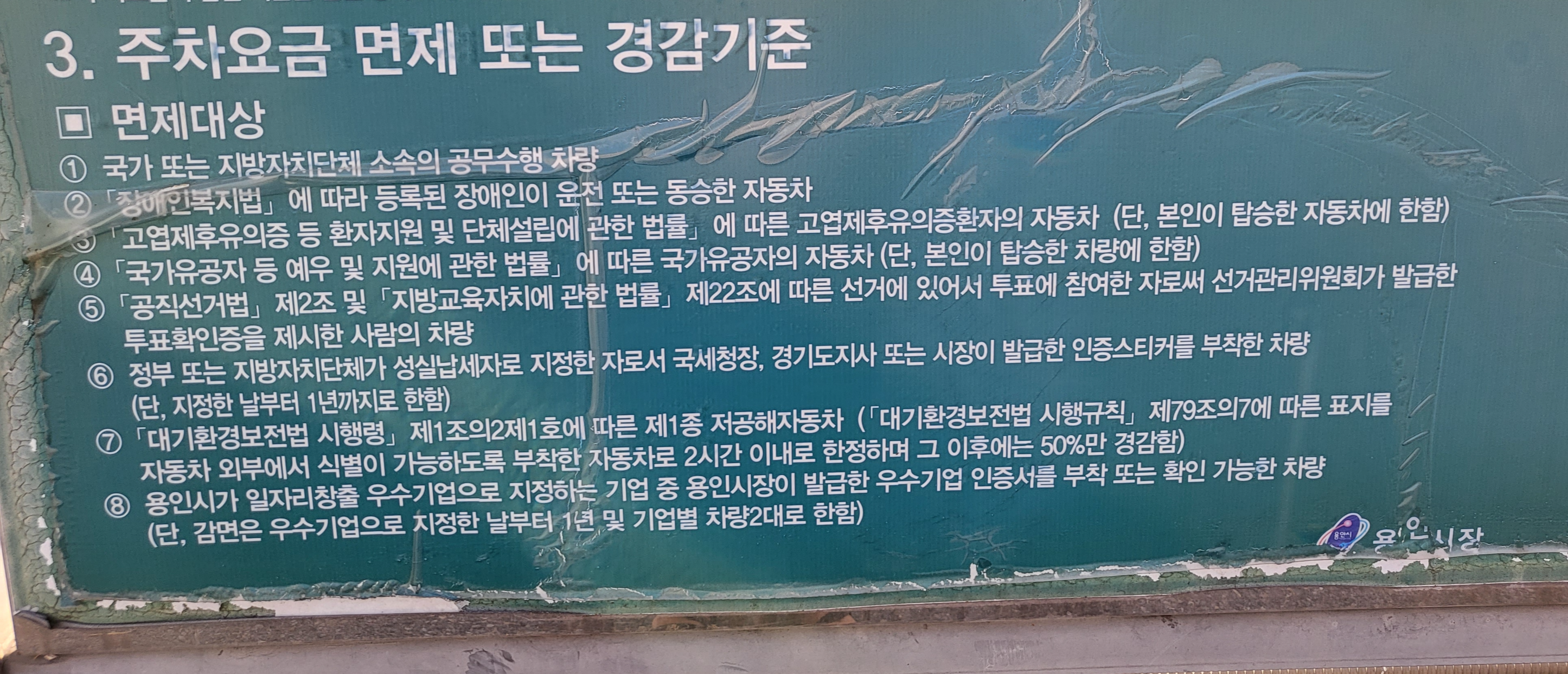 장애인, 국가유공자 등은 주차요금이 면제되고 경차는 50% 경감됩니다. 그밖에 주차요금 면제 및 경감 대상, 제한차량, 기타사항은 위 사진을 참고해 주세요.